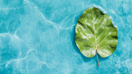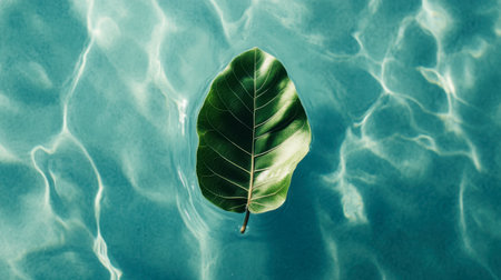 A single green leaf floats on a serene, clear blue water surface, showcasing a beautiful contrast between nature and tranquility. Perfect for eco-friendly themes.
