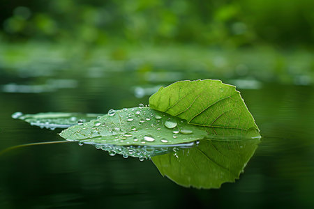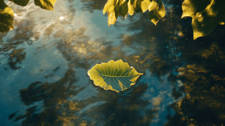 A vibrant green leaf floats peacefully on the surface of calm water, reflecting the beauty of the surrounding nature and evoking a sense of tranquility and serenity.