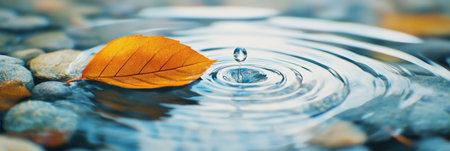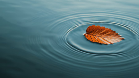 Orange autumn leaf floating on dark blue water, generating concentric ripples, symbolizing impact and tranquility in nature