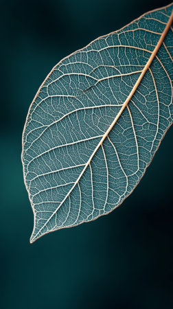 Close-up of leaf skeleton on dark teal background, nature detail concept