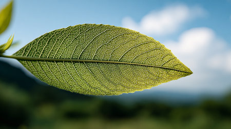 Serene Green Leaf Veins against a Blurred Sky Background, Capturing Nature