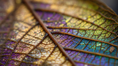 This macro photograph showcases a detailed view of a leaf with vibrant colors and intricate vein patterns. The image highlights a mix of hues including yellow, purple, and brown, with a focus on texture. Suitable for various projects, it offers a visually appealing element suitable for commercial applications.