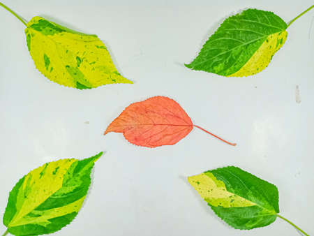 Colorful autumn leaves on a white background, close-up.