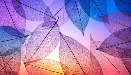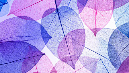 A visually striking arrangement of translucent skeleton leaves creates an abstract pattern with a gradient of pink, purple, and blue light.