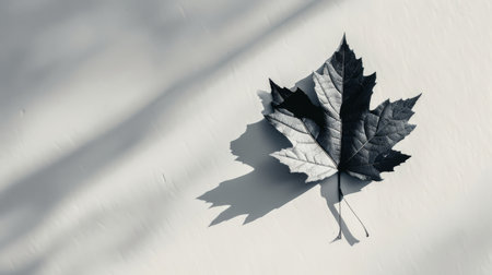 A striking close-up showcases a single, dark maple leaf. The image features high contrast with the leaf's intricate details visible against a bright backdrop. The composition suggests an isolated environment. Suitable for artistic projects, design elements, and various commercial applications, this image offers versatility.