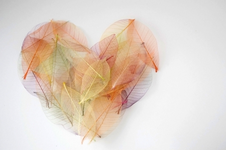 Colored skeletons of leaves on light background. Flat lay.