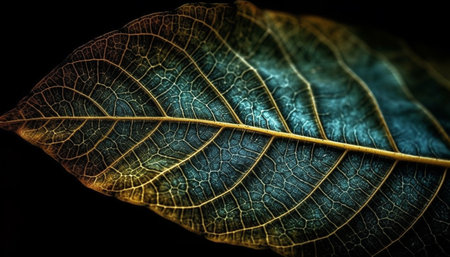 Vibrant leaf vein pattern on black background showcases natural beauty generated by artificial intelligence