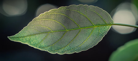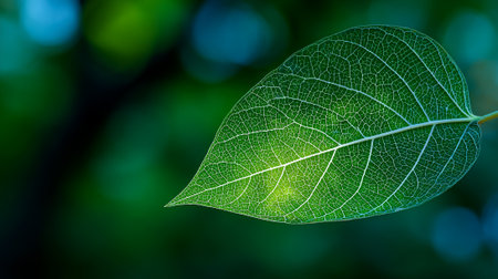 Translucent green leaf with intricate veins shining in the sunlight, nature's beauty.