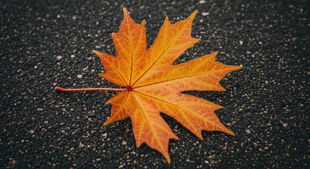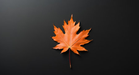 A vibrant orange maple leaf lying on a textured dark surface