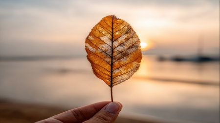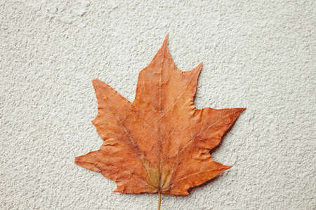 Close up of autumn leaf on the beach at sunset. Nature background