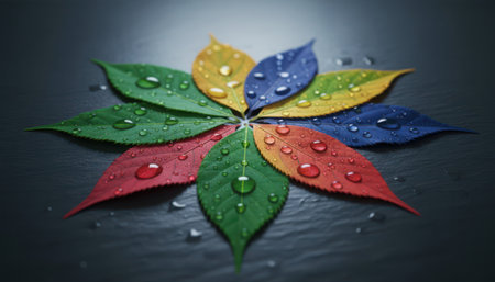 A striking close-up composition featuring an array of multi-colored leaves arranged in a circular, blossom-like pattern. The leaves display a vibrant spectrum of hues, including green, yellow, blue, red, and orange, creating a visually appealing gradient. Each leaf is adorned with numerous glistening water droplets, suggesting morning dew or recent rainfall, imparting a profound sense of freshness, vitality, and purity. The dark, textured background provides a dramatic contrast, making the bright, translucent water beads and rich leaf colors stand out prominently. This harmonious and symmetrical arrangement evokes themes of nature's inherent beauty, diversity, growth, and renewal.