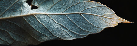 A detailed close up of a dried leaf reveals its intricate veins and textured surface, contrasting beautifully against a dark background. The natural design highlights the leaves unique features.
