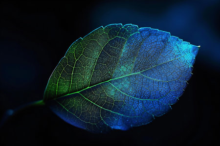 close up of a green leaf with blue light on a dark background
