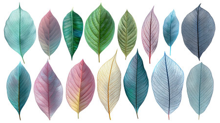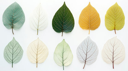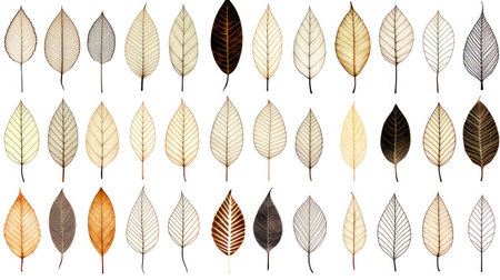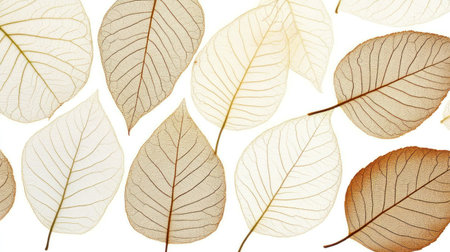A collection of delicate, translucent leaves arranged on a light background, showcasing intricate vein patterns and soft textures. Concept: Translucent Leaves, Intricate Veins, Delicate Nature