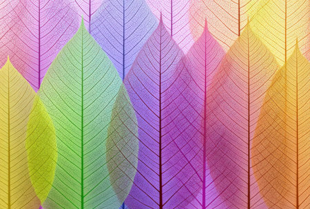 Colorful, translucent leaf skeletons layered in vertical rows, transitioning rainbow hues