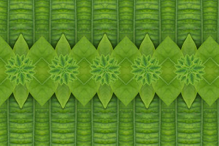 A repeating geometric pattern formed by lush green banana leaves with visible veins and textures.