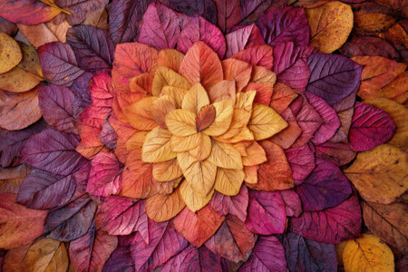 Colorful arrangement of leaves in gradient hues from yellow in the center to deep purple at the edges, creating a mesmerizing floral pattern using only natural foliage