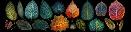 A stunning array of vibrant leaves displayed on a dark background showcases the beauty of nature. Ideal for creative projects, home decor, and artistic inspirations.