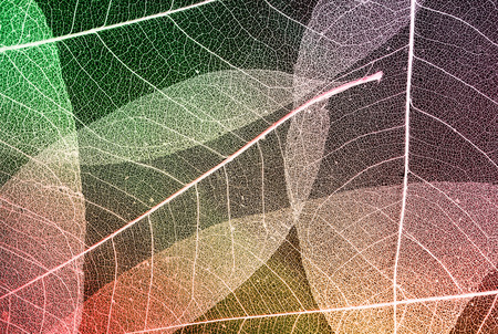 natural colorful background with delicate beautiful transparent fishnet skeletons of leaves