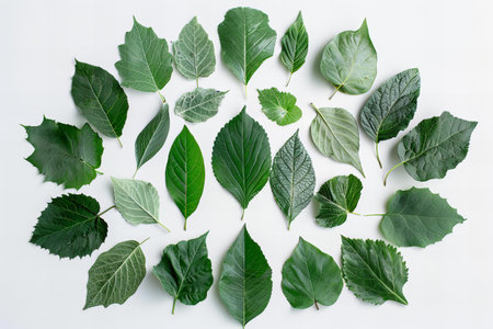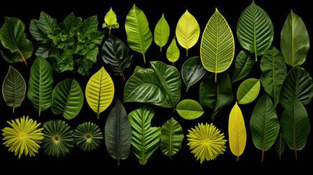 A vibrant collection of diverse green leaves arranged artistically on a dark background, showcasing unique textures and patterns of nature s foliage