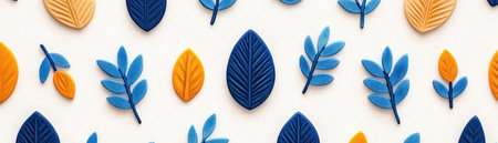 Colorful leaves and foliage in blue, orange, and yellow patterns on a white background.
