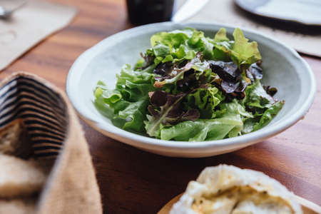 Fresh green lettuce salad in ceramic plate