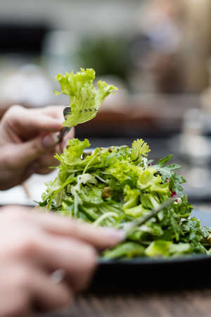 Healthy food and eating. Green salad in male hand.