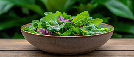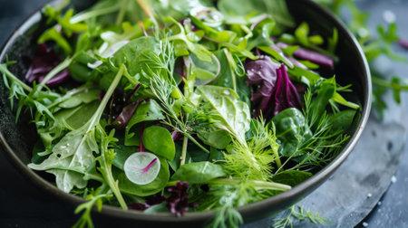 a healthy bowl of fresh leafy vegetables, including spinach, kale, and arugula, served with a light lemon vinaigrette.