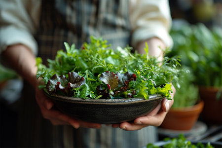Fresh herbs for salad in the bowl. Healthy food, diet and cooking concept. Shallow depth of field