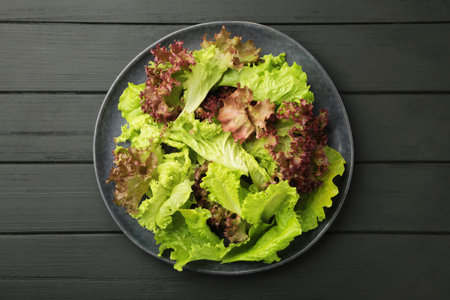 Mix of lettuce leaves different types on black table.