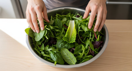 A high-angle, close-up shot shows a person's hands tossing a fresh green salad in a large stainless steel bowl. The salad consists of various mixed greens, including spinach, arugula, and romaine lettuce.