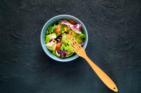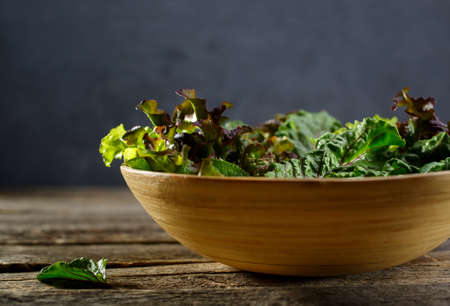 Healthy salad, leaves mix salad on a wooden board on black concrete background