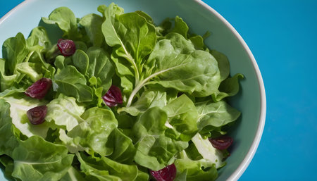 Closeup view of a bowl of green salad over blue backdrop