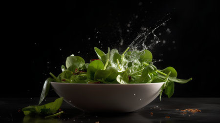 Fresh green salad in white bowl with splashes of water on black background