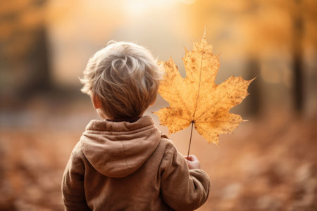 Smiling blond child holding a dry maple leaf in front of his face, enjoying a sunny autumn day in the park surrounded by vibrant foliage and golden colors of the season