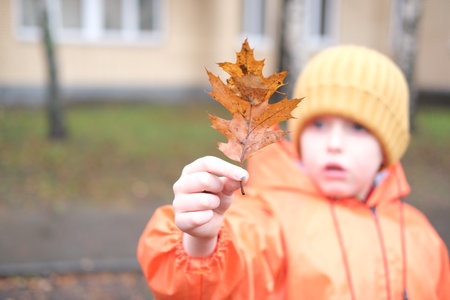 Close Up of Child's Hand in Orange Jacket Holding a Dew-Kissed Autumn Leaf on a Moody Day