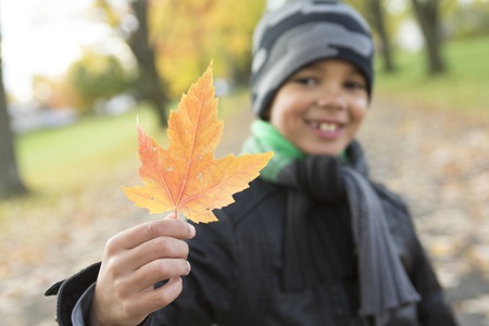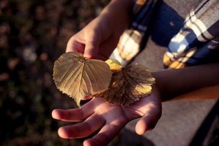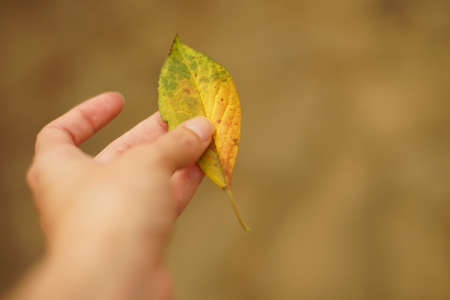 Yellow autumn leave in hands. boy holding a leaf in a public park during Autumn