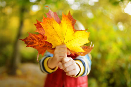 Child covers his eyes with a yellow maple leaf. Kids walking in autumn park. Cute boy playing with maple leaves outdoors. Toddler wears Autumn. Autumn child portrait.