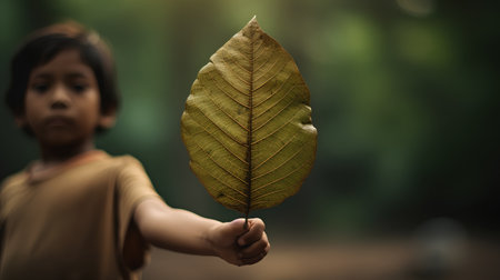 Close-up of a 5-year-old child holding a small leaf, examining it with curiosity. The image features natural light, a gentle smile, and a soft bokeh of greenery in the background.