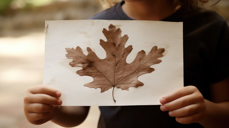 Female hand holding gently colorful autumn leaves. A person's hand holds two vibrant autumnal leaves, showing their intricate patterns and earth colors against a blurred background Human and nature