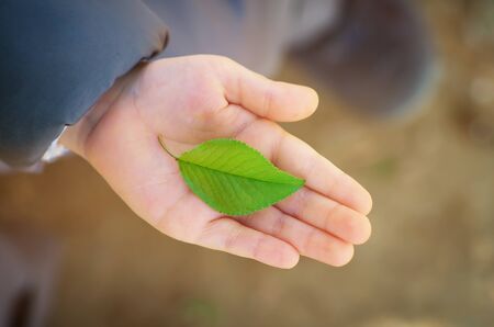 The child holds a leaf in his hands, to protect nature. selective focus. kid.
