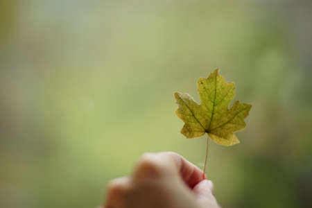 Close-up of a hand gently pinching a green maple leaf, held up against a backdrop of autumn trees with golden and red leaves.
