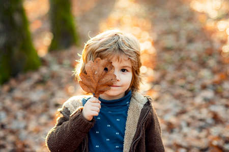 Beautiful preschool boy, holding big leaf in front of his face, looking at camera, sunny autumn day in the park on sunset