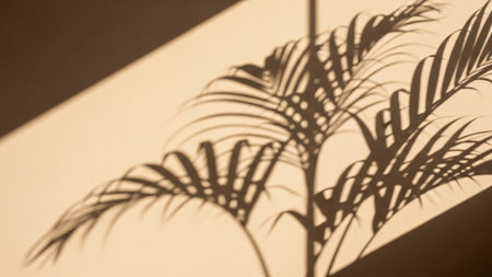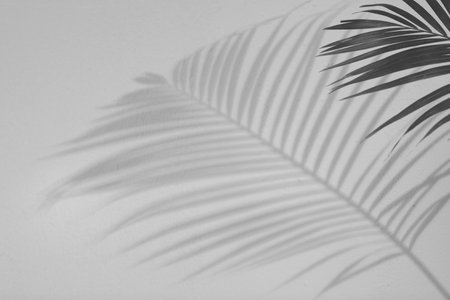 A dark shadow of a palm leaf is cast diagonally across a textured white surface. Clear details and vibrant col...