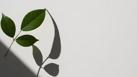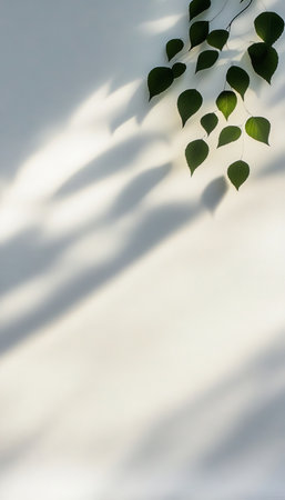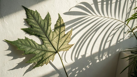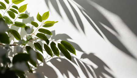 Green leaves cast delicate shadows on a white background
