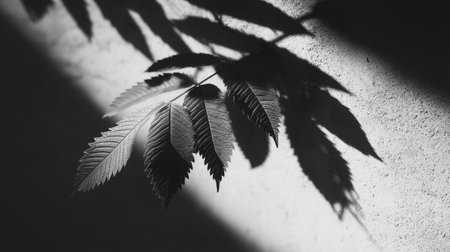 A captivating black and white photograph capturing the intricate shadows cast by a leaf on a textured wall, highlighting natural beauty and elegance in soft light.