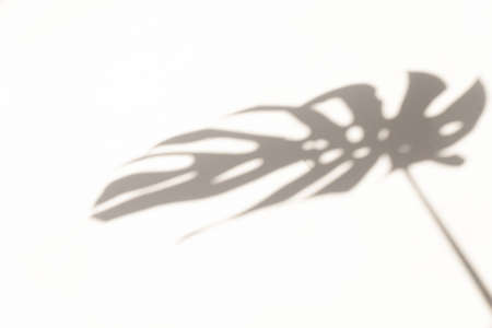 Monstera leaf shadow overlay on white wall background. Shadow of tropical leaves on the white wall. Big tropical plants, vines monstera.