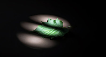 A single green leaf elegantly sits in a soft spotlight, casting a dreamy shadow on a dark background. A serene capture showcasing nature simple beauty. Generated A.I.