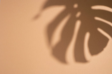 Shadow of a tropical leaf of monstera on a light brown background. Top view, flat lay.
