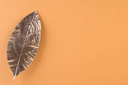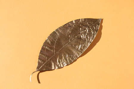 Leaves painted in gold on an orange background. Golden autumn concept.